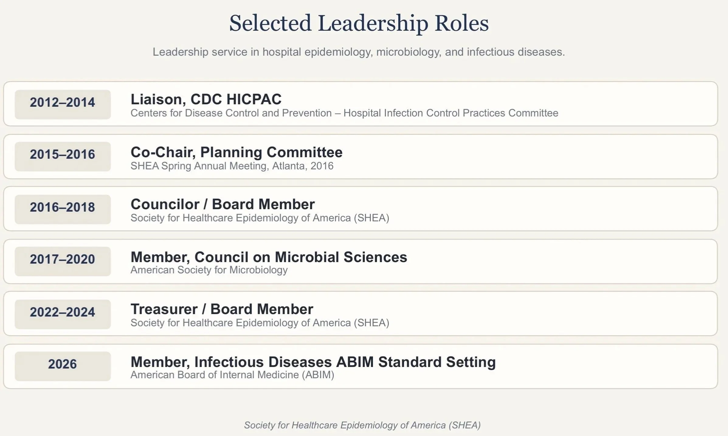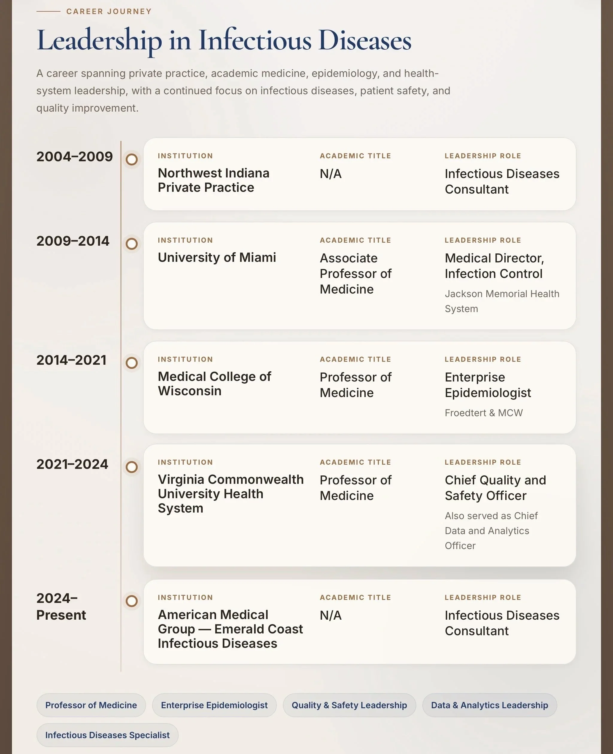 Throughout my career, I have been a Hospital Epidemiologist in major academic health systems in Miami, FL and Milwaukee, WI, and I also served as Chief Quality and Safety Officer at an academic health system in Richmond, VA. These roles focused on infection prevention, patient safety, and improving the quality of care for entire hospitals and health systems.